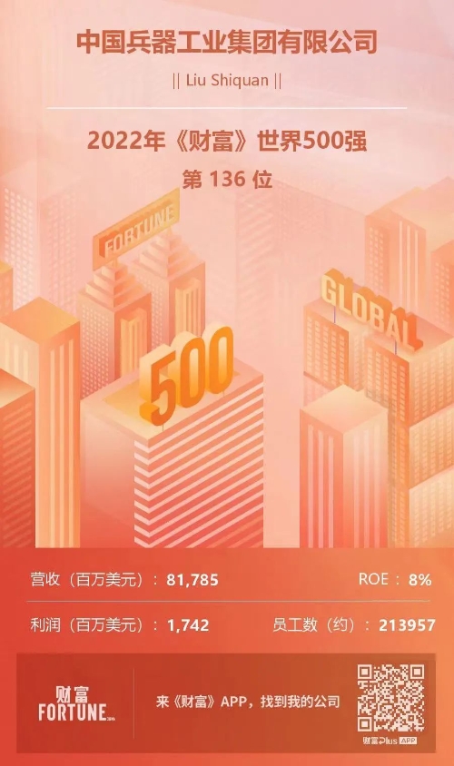 兵器工業(yè)集團(tuán)位列2022年《財(cái)富》世界500強(qiáng)第136位