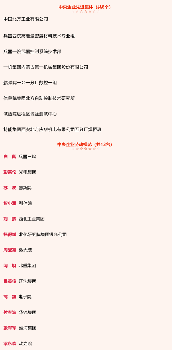 兵器工業集團8個集體和13名個人獲中央企業先進集體和勞動模范表彰